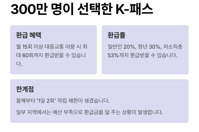 하지만 아쉬운 점도 있습니다. 올해부터 '1일 2회' 적립 제한이 생겨, 출퇴근 외 이동이 잦은 분들은 혜택을 제대로 받지 못하게 되었거든요. 또한 일부 지역에서는 예산 부족으로 환급금을 덜 주는 상황도 발생하고 있다고 합니다.